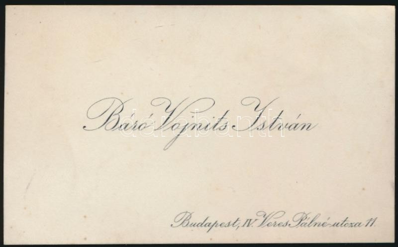 cca 1880-1900 Báró Vojnits István (1856-1921) főrendiházi tag, a Szabadelvű Párt elnökének névjegye, hátoldalon saját kezű köszönetével
