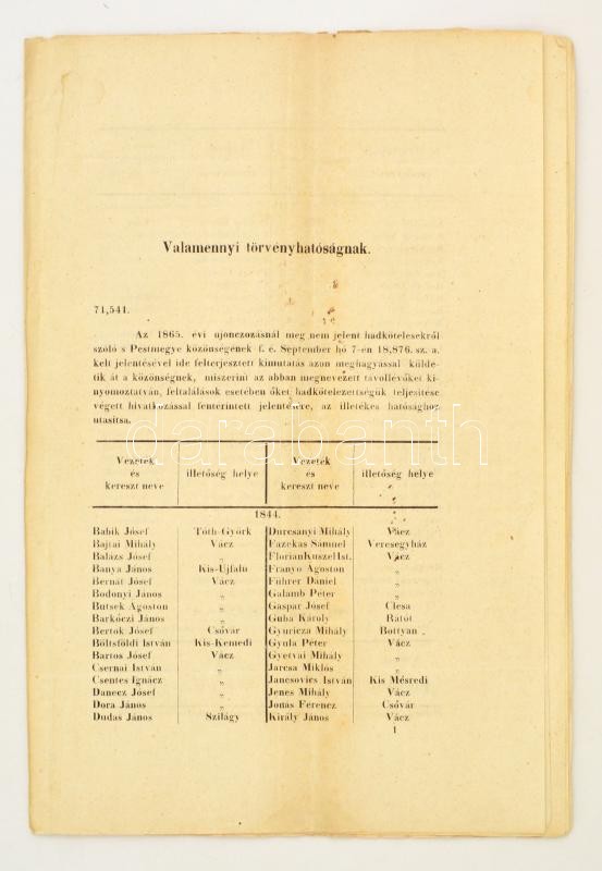 Description: 1865 M. Kir. Helytartótanács körlevele valamennyi törvényhatóságnak (Nógrád megye közönségének, Balassagyarmat) az újoncozáskor meg nem jelent hadkötelesekről, benne névjegyzékkel, 12 sztl. lev.