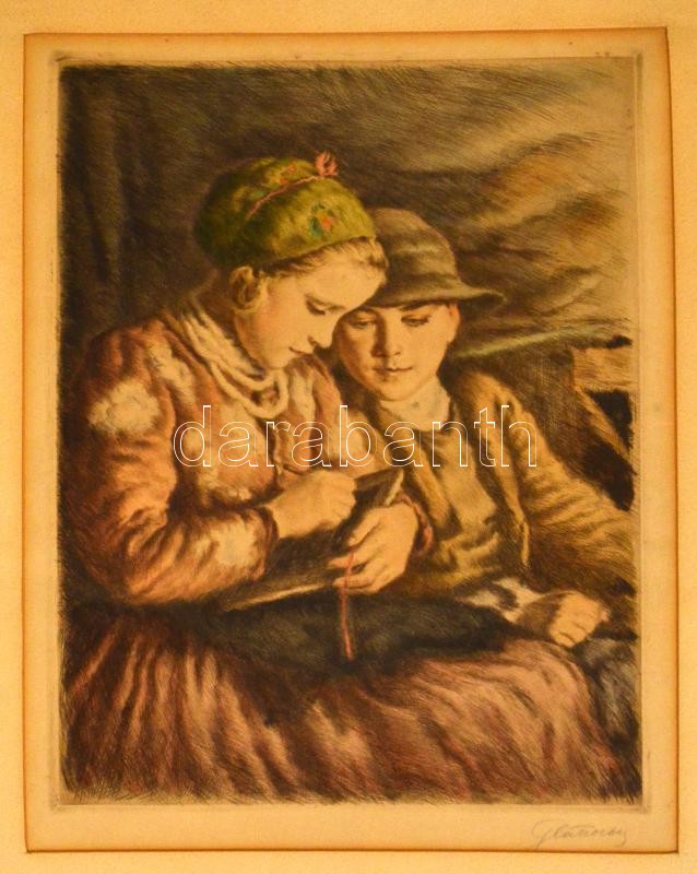 Glatz Oszkár (1862-1958): Betűvetés, színezett rézkarc, papír, jelzett, paszpartuban, 37×29 cm