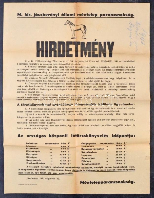1941 M. kir. jászberényi méntelep parancsnokság hirdetménye országos lótörzskönyvezés elrendeléséről, hajtott, 63x47 cm