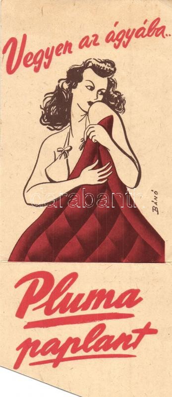 Vegyen az ágyba Pluma paplant! Finoman erotikus kinyitható reklámlap / Hungarian quilt advertisement. Gently erotic folding card s: Bánó (non PC) (EK)