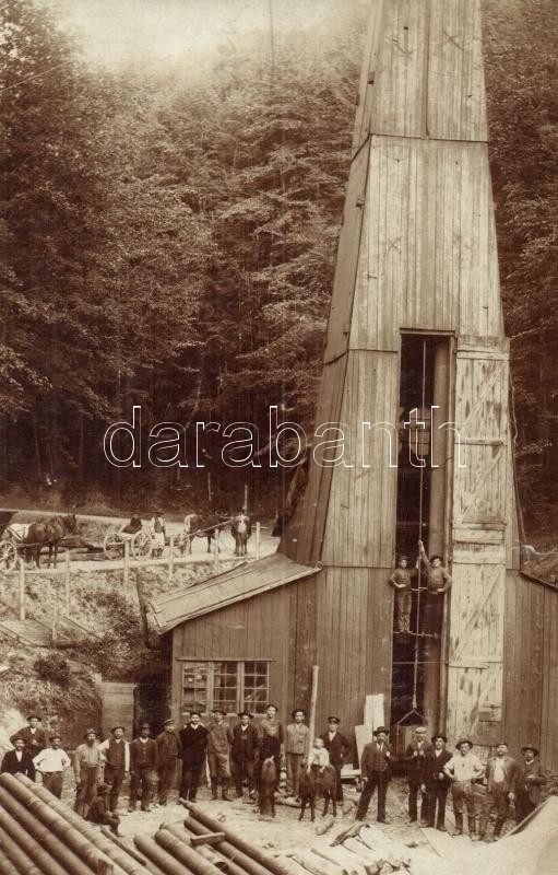 1909 Anina, Stájerlakanina, Steierdorf; fúrótorony mélyésgi munkához munkásokkal, nagy mennyiségű csőfúró betéttel / oil rig with workers. photo
