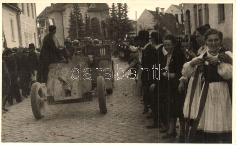 1940 Csíkszereda, Miercurea Ciuc; bevonulás, ünneplő tömeg, tank. Aladics okleveles mérnök felvétele / entry of the Hungarian troops, celebrating crowd, military tank. Original photo!