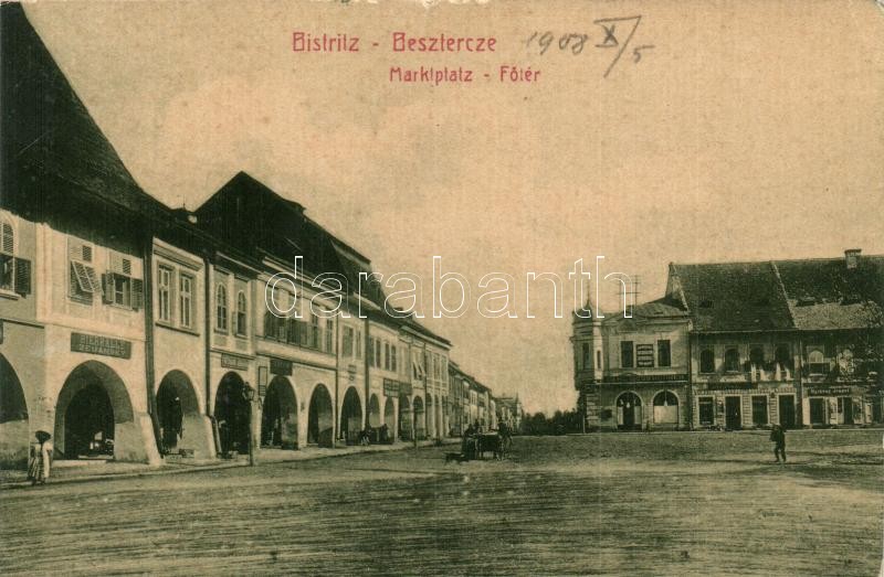 Beszterce, Bistritz, Bistrita; Marktplatz / Fő tér, Zemansky sörcsarnok, Carl Lebkuchner, Nyitray József, Friedmann Ábrahám üzletei. No. 392. / main square, beer hall, inn, shops (EK)