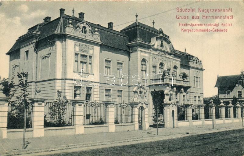 Nagyszeben, Hermannstadt, Sibiu; Hadtestparancsnoksági épület. W. L. 5... https://www.darabanth.com/en/317-Online-auction/317.0/Postcards/Transylvania~1000005/Nagyszeben-Hermannstadt-Sibiu-Hadtestparancsnoksagi-epulet-W-L-58-Kiadja-Budovszky-L-Ko~II1745048