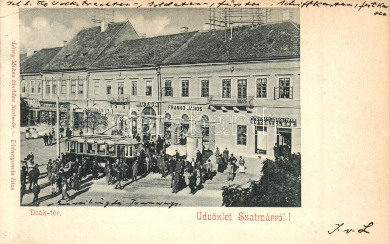 Szatmárnémeti, Szatmár, Satu Mare; Deák tér, Frankó János, Kerekes Zs., Győri Károly üzletei, Szatmári Asztalosok bútortelepe, étterem, villamos, tömeg. Löwy Miksa kiadása / square, shops, carpenters' furniture workshop, restaurant, tram, crowd (r)