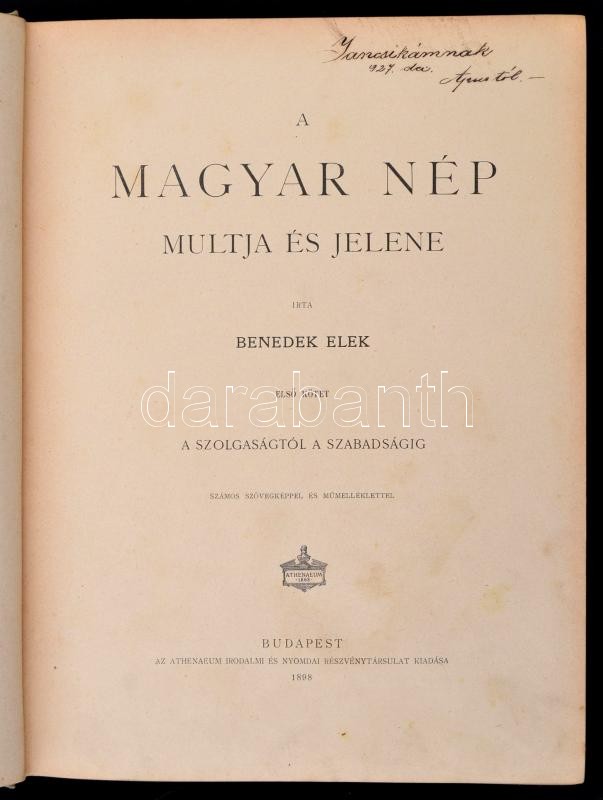 Benedek Elek: A magyar nép múltja és jelene. 1. köt.: A szolgaságtól a szabadságig. 2. köt.: A bölcsőtől a sírig. Bp. 1898. Athenaeum. 558 l. 1 sztl. lev.; 463 l. 2 sztl. lev. 30 t.; 21 t. Szövegközti képekkel is gazdagon illusztrálva. Kiadói, festett, aranyozott, egészvászon-kötésben. Az első kötet szép állapotban, a második foltos, megviselt kötéssel