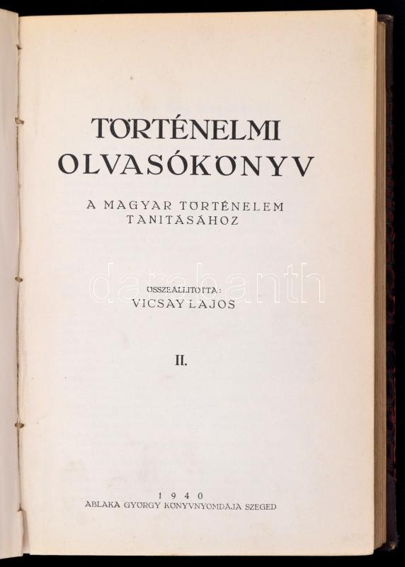 Description: Történelmi olvasókönyv a magyar történelem tanításához I.-II. kötet. (Egybekötve.) Összeállította: Vicsay Lajos. Szeged, 1940, Ablaka György Könyvnyomdája, 247+2+304 p. Átkötött félvászon-kötés, kissé kopottas borítóval, de belül jó állapotban.