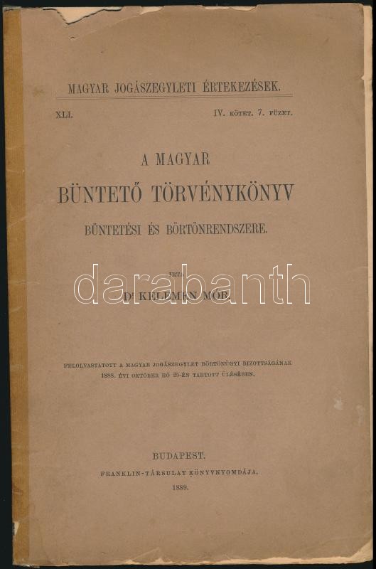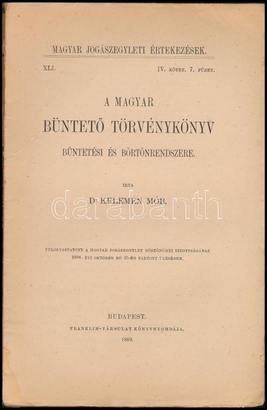 Dr. Kelemen Mór: A magyar büntetÅ‘ törvénykönyv büntetései és börtönrendszere. Magyar Jogászegyleti Értekezések. XLI. IV. kötet. 7. füzet. Bp., 1889, Franklin, 55 p. Kiadói papÃrkötés, javÃtott gerinccel, felvágatlan lapokkal.