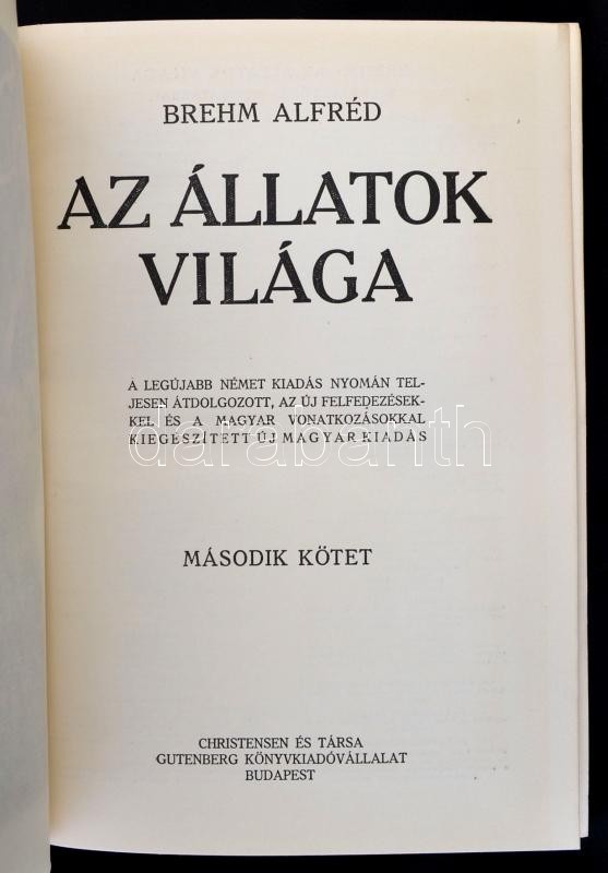 Brehm: Az állatok világa II. Emlősök. Majmok - Félmajmok - Párosujjú patások. Szerk. Dr. Éhik Gyula. Bp., Christensen és Társa, Gutenberg Könyvkiadóvállalat. Aranyozott félbőr kötés, kissé kopottas állapotban.
