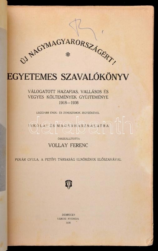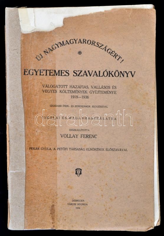 Description: Egyetemes szavalókönyv. Válogatott hazafias, vallásos és vegyes költemények gyűjteménye 1918-1936. Összeáll.: Vollay Ferenc. Debrecen, 1936, Városi Nyomda. Korpás Ferenc (?-?), a Verbőczy István Reálgimnázium igazgatójának ajándékozási bejegyzésével, javított papírkötésben.