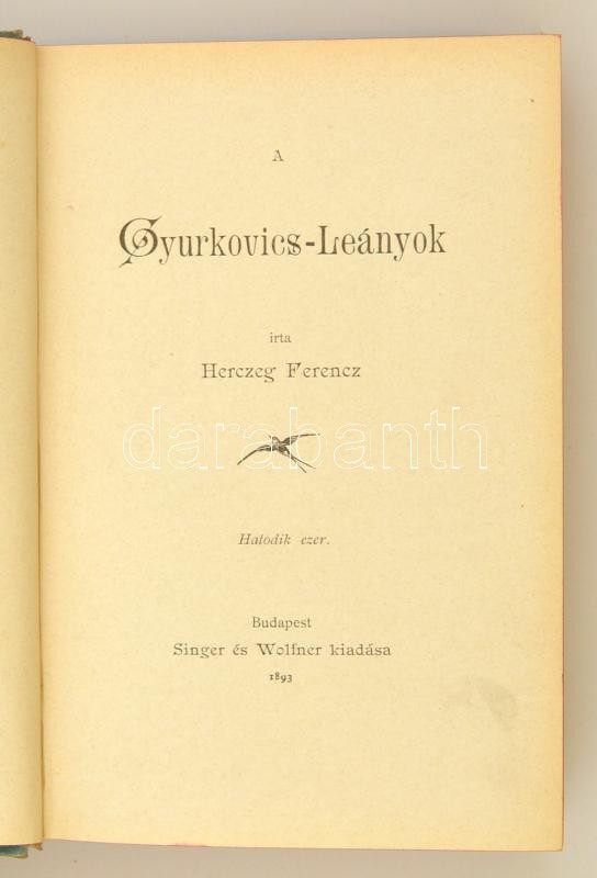 Herczeg Ferenc: A Gyurkovics Leányok. Bp., 1893, Singer és Wolfner. Ki... https://www.darabanth.com/en/318-Online-auction/318.0/Books/Books-Other-rarities~1500016/Herczeg-Ferenc-A-Gyurkovics-Leanyok-Bp-1893-Singer-es-Wolfner-Kiadoi-aranyozott-cimerrel-~II1532777