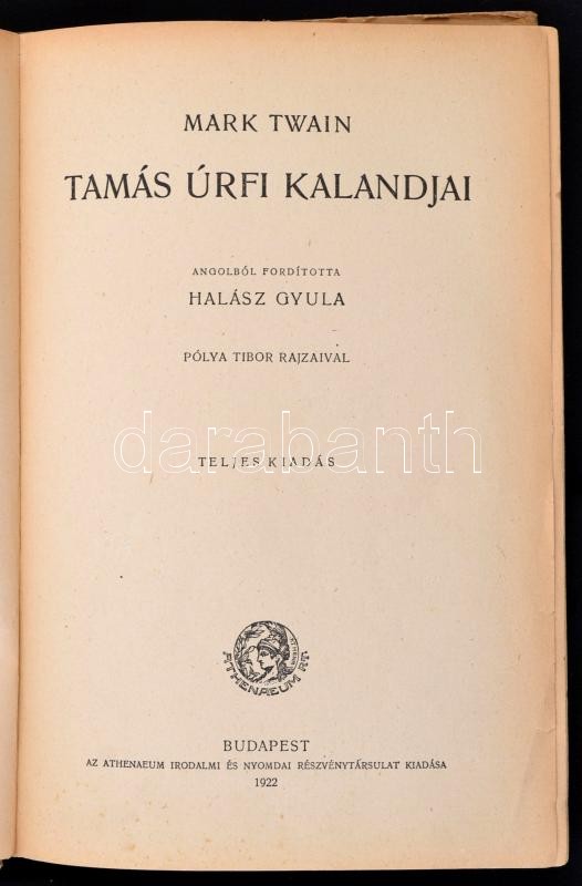 Mark Twain: Tamás úrfi kalandjai. Fordította: Halász Gyula. Pólya Tibo... https://www.darabanth.com/en/318-Online-auction/318.0/Books/Books-Other-rarities~1500016/Mark-Twain-Tamas-urfi-kalandjai-Forditotta-Halasz-Gyula-Polya-Tibor-rajzaival-Bp-1922-At~II1757828
