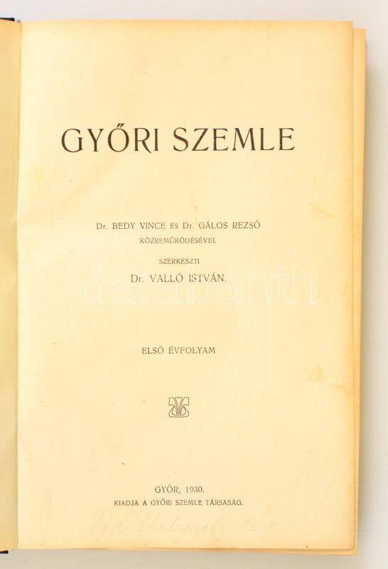 Dr. Valló István: Győri Szemle Első évfolyam. Győr, 1930, Győri Szemle Társaság. Félvászon kötésben, kissé kopottas állapotban.
