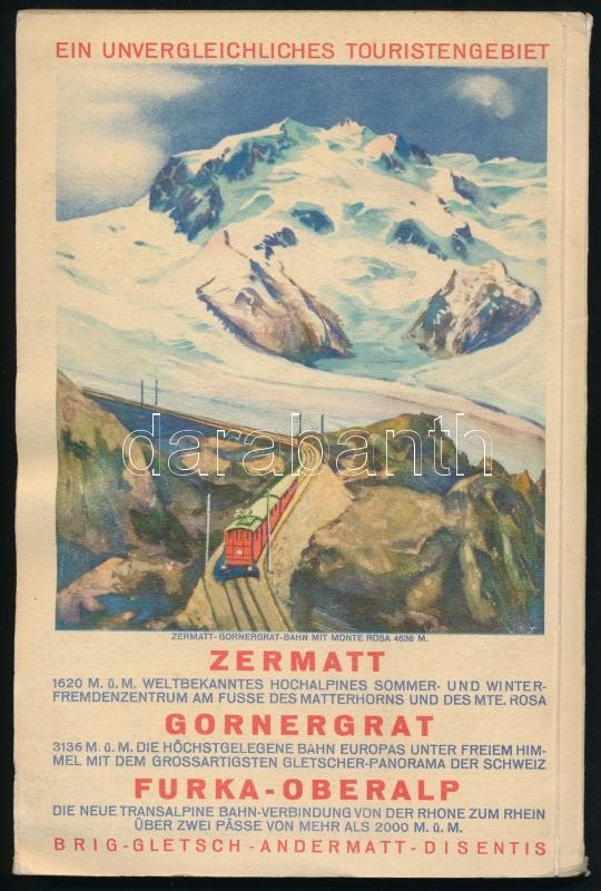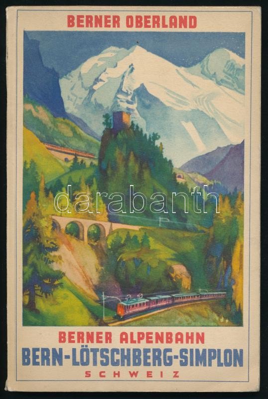 Description: Illustrierter Führer durch das Berner Oberland und über die Lötschbergbahn. Zurich, 1929, Brunner&Co., 96+8 p.+ 1 kihajtható térképpel. Fekete-fehér fotókkal, korabeli reklámokkal. Kiadói papírkötés, az utolsó lapon hibajavítós folttal./ Paperbinding, in German language.
