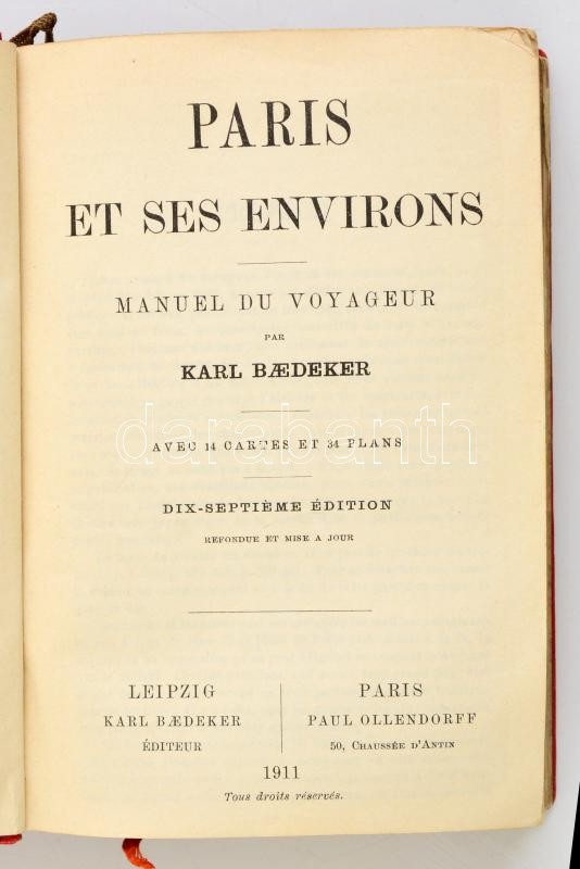 Karl Baedeker: Paris et ses environs. Appendice du Guide a Paris. Leipzig-Paris, 1911, Karl Baedeker, XXVI+481 p.+58 p. 17. kiadás. Számos térképpel illusztrált. Francia nyelven. Kiadói aranyozott egészvászon-kötés, festett lapélekkel, jó állapotban./ Linen-binding, in French language. 17. Edition.