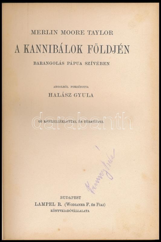 Merlin Moore Taylor: A kannibálok földjén. Barangolás Pápua szívében. Fordította: Halász Gyula. Magyar Földrajzi Társaság Könyvtára. Bp., é.n., Lampel R. (Wodianer F. és Fiai) Rt. Kiadói dúsan aranyozott egészvászon sorozatkötés, kopott borítóval.