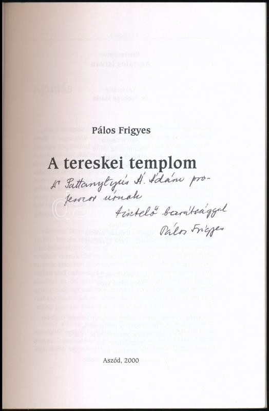 A szerző, Pálos Frigyes (1924- ) katolikus pap, prépost, művészettörténész, a váci Egyházmegyei Gyűjtemény igazgatójának dedikációjával Pattantyús Á. Ádám (1929-2013) építészmérnök, egyetemi tanár részére.