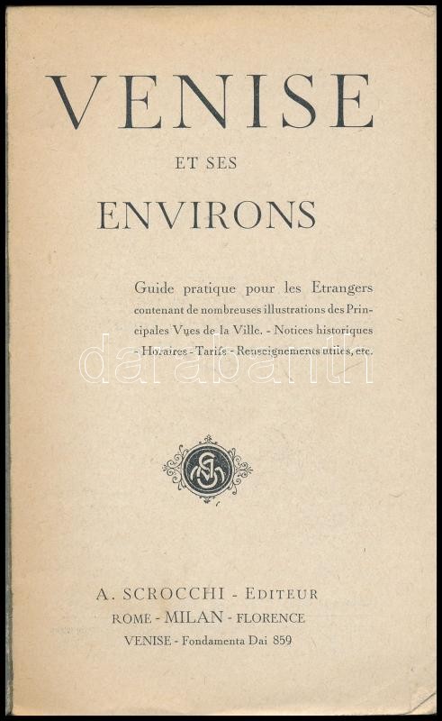Venise et ses environs. Rome-Milan-Florence-Venise, é.n., A. Scrocchi, XVII+206 p.+ 1 kihajtható térképpel. Francia nyelven. Kiadói papírkötés, az elülső borító alsó sarkán kis sérüléssel. / Venise et ses environs. Rome-Milan-Florence-Venise, A. Scrocchi, XVII+206 p.+ 1 map. In French language. Paperbinding, with little damage on the cover.