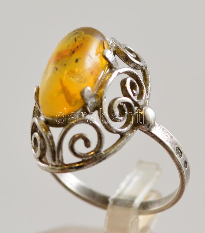 Ezüst(Ag) gyűrű, borostyán díszítéssel, jelzett, méret: 52, bruttó: 2,5 g