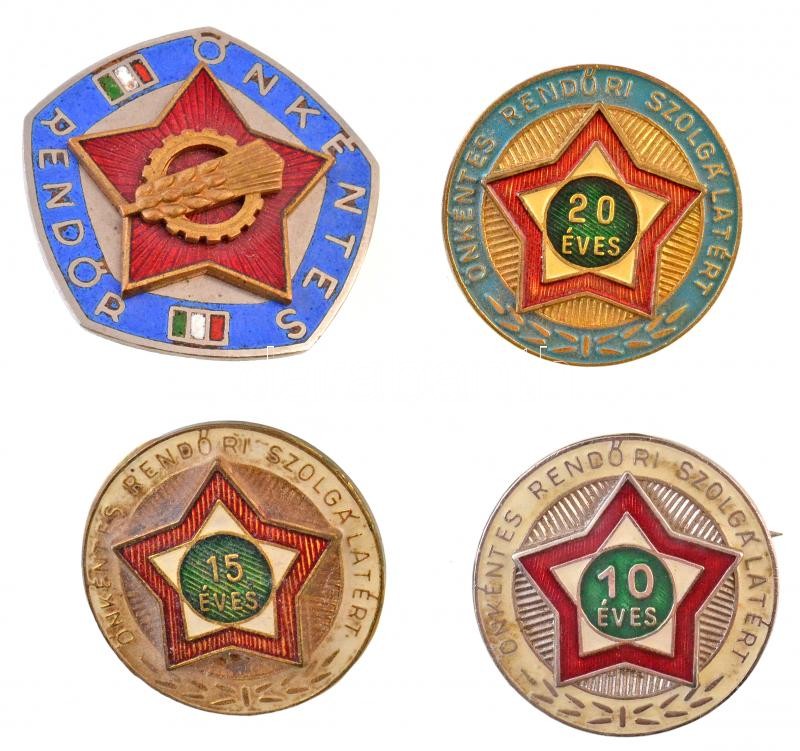 ~1970-1980. "Önkéntes Rendőri Szolgálatért 10, 15, 20" (3xklf) zománcozott fém jelvények + "Önkéntes Rendőr" zománcozott fém jelvény T:2