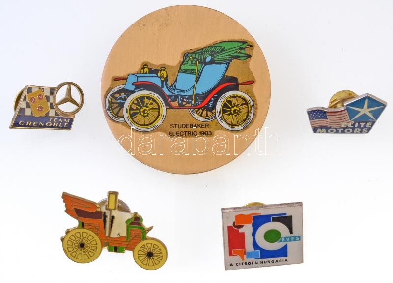 DN 5db-os autózással kapcsolatos jelvény és kitűző tétel, közte "Team Grenoble", "10 éves a Citroen Hungária", "Elite Motors"