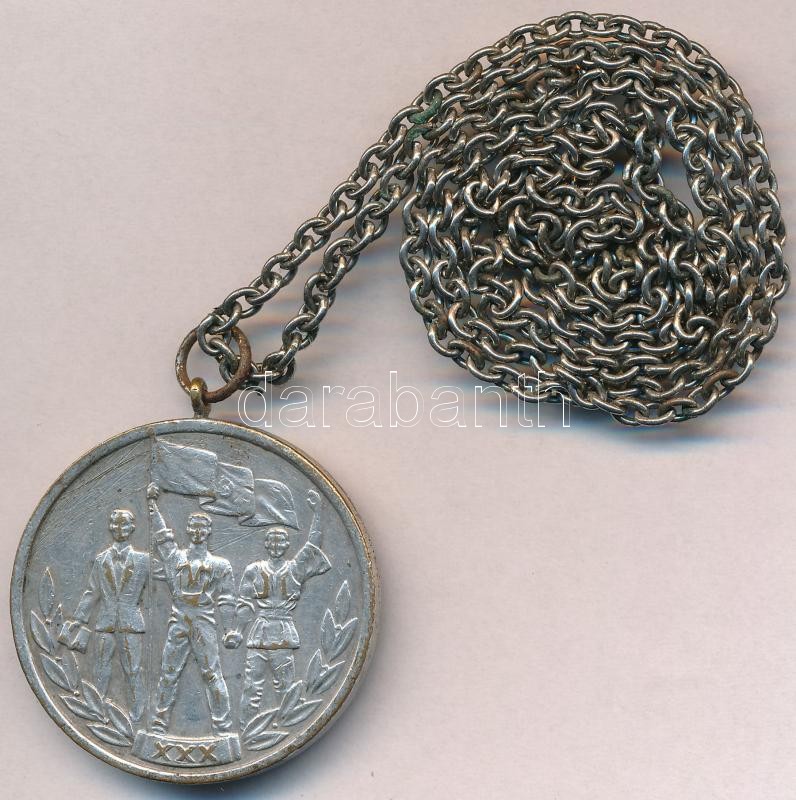 Románia ~1974. "30 éve szabadult fel Románia a fasizmus alól" ezüstözött Br emlékérem láncon (35mm) T:2- Romania ~1974. "30 years since Romania was freed from fascism" silver plated Br medallion on chain (35mm) C:VF