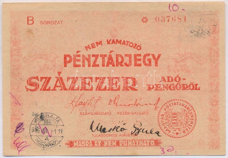 1946. 100.000AP nem kamatozó Pénztárjegy "Másra Át Nem Ruházható", "Kunbaja" bélyegzéssel, hátoldalán ékezethiány "számu" T:II