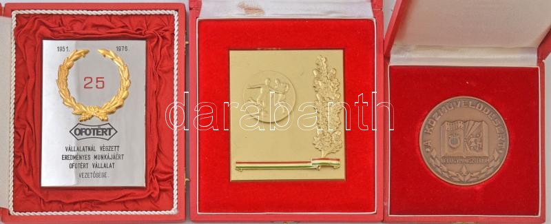 Egy doboznyi vegyes szocialista plakett és emlékérem tétel, közte "Közművelődését - Belügyminisztérium" Br plakett, eredeti tokban T:2