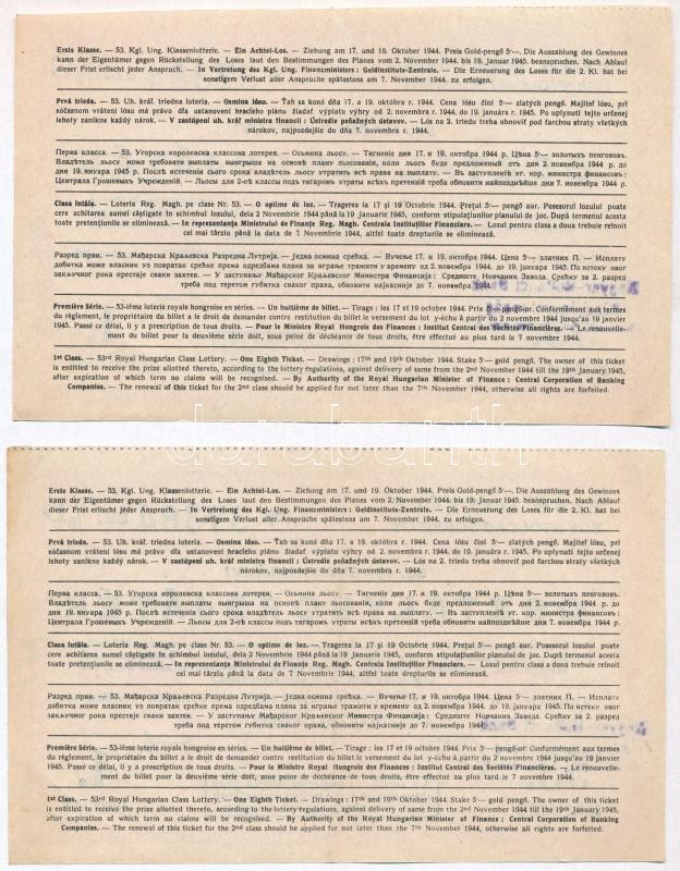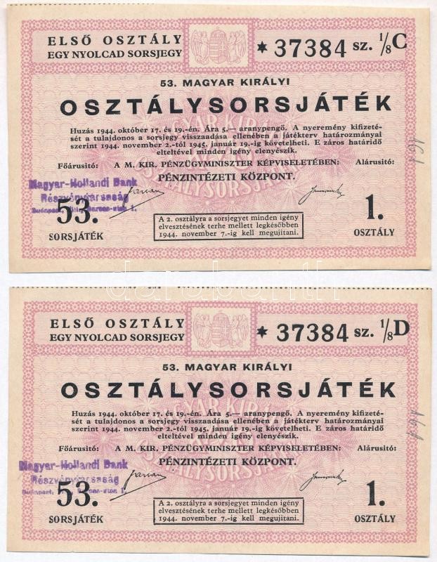 Description: 1944. "53. Magyar Királyi Osztálysorsjáték" első osztály 1/8 sorsjegye (2x) 1/8C és 1/8D, mindkettő "Magyar-Hollandi Bank Részvénytársaság" felülbélyegzéssel T:II,II-