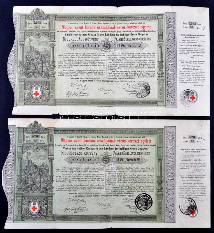 Budapest 1882. "Magyar szent korona országainak vörös-kereszt egylete" kisorsolási kötvény 5Ft-ról bélyegzésekkel (2x) T:III kis szakadások