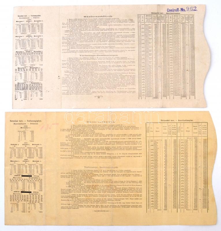 Budapest 1882. "Magyar szent korona országainak vörös-kereszt egylete" kisorsolási kötvénye 5Ft értékben, felülbélyegzéssel + 1886. "Egyházi Műemléki Alap" sorsjegykölcsön 5Ft-ról a lipótvárosi bazilika felépÃtésére és egyházi műemlékek fenntartására, bélyegzéssel T:III,III-