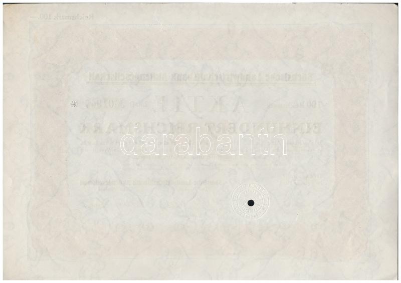 Németország / Weimari Köztársaság / Drezda 1926. "Szász Mezőgazdasági Bank Részvénytársaság" részvénye 100M-ról, szárazpecséttel, lyukasztással érvénytelenítve T:I-