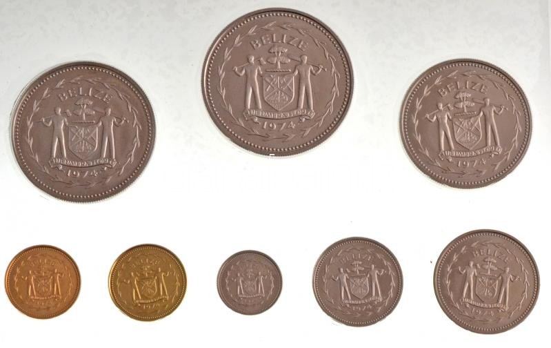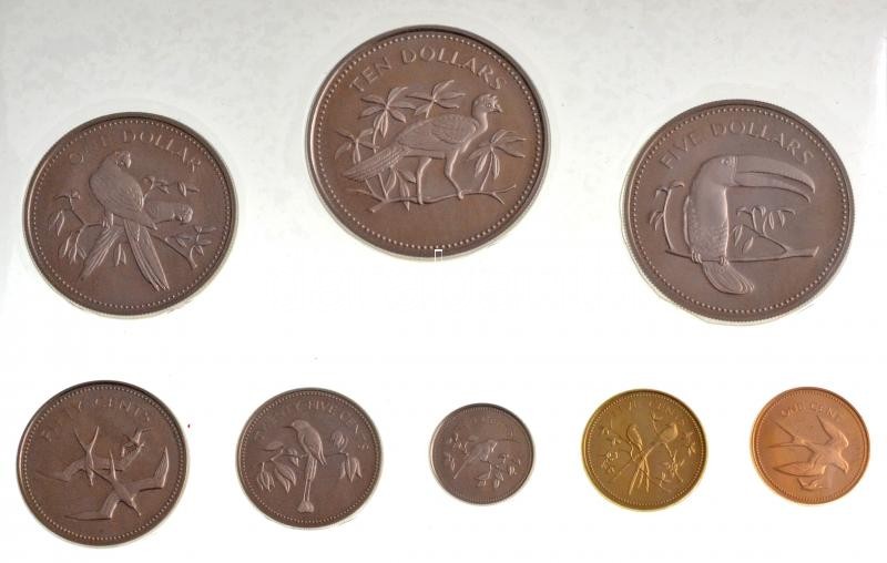 Belize 1974. 1c Br "Fecskefarkú kánya" + 5c Ni-sárgaréz "Villásfarkú tirannusz" + 10c Cu-Ni "Hosszúfarkú remetekolibri" + 25c Cu-Ni "Diadém-motmot" + 50c Cu-Ni "Fregattmadár" + 1$ Cu-Ni "Arakanga" + 5$ Cu-Ni "Szivárványcsőrű tukán" + 10$ Cu-Ni "Nagy hokkó" erdeti díszdobozban, fóliacsomagolásban, tanúsítvánnyal és tájékoztatóval T:PP Belize 1974. 1 Cent Br "Swallow-tailed kite" + 5 Cents Ni-sárgaréz "Forktailed flycatcher" + 10 Cents Cu-Ni "Longtailed hermit" + 25 Cents Cu-Ni "Blue-crowned motmot" + 50 Cents Cu-Ni "Frigate bird" + 1 Dollars Cu-Ni "Scarlet macaw" + 5 Dollars Cu-Ni "Keel-billed toucan" + 10 Dollars Cu-Ni "Great curassow" in foil packing and original case, with certificate and information sheet C:PP Krause KM#38, KM#39, KM#40, KM#40, KM#41, KM#42, KM#43, KM#44, KM#45