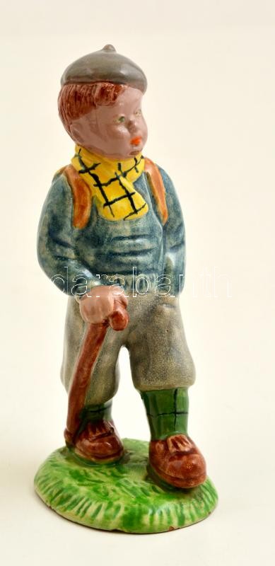 Izsépy túrázó kisfiú, mázas kerámia figura, kézzel festett, mázhibával...