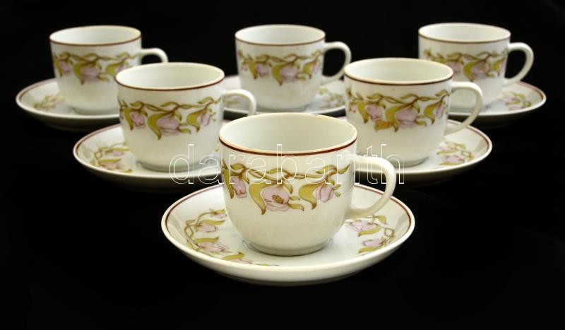 Hollóházi mokkás csésze és alj ( 6 db), matricás, jelzett, hibátlan