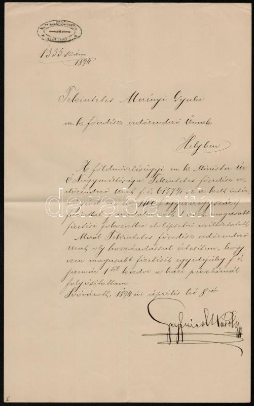 Description: 1894 Sóvár (Tótsóvár, ma Solivar, Szlovákia), a sóvári magyar királyi erdőhivatal fizetési értesítése Merényi Gyula (?-?) főerdész, erdőrendező részére