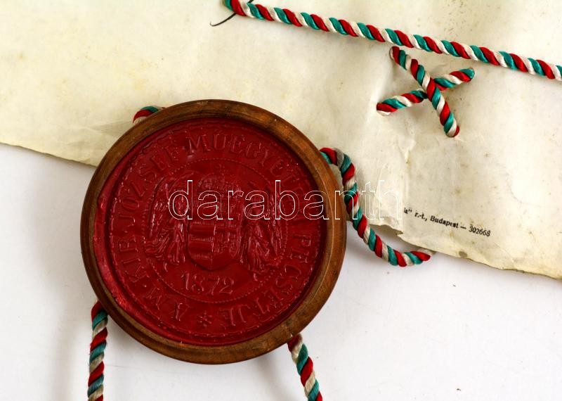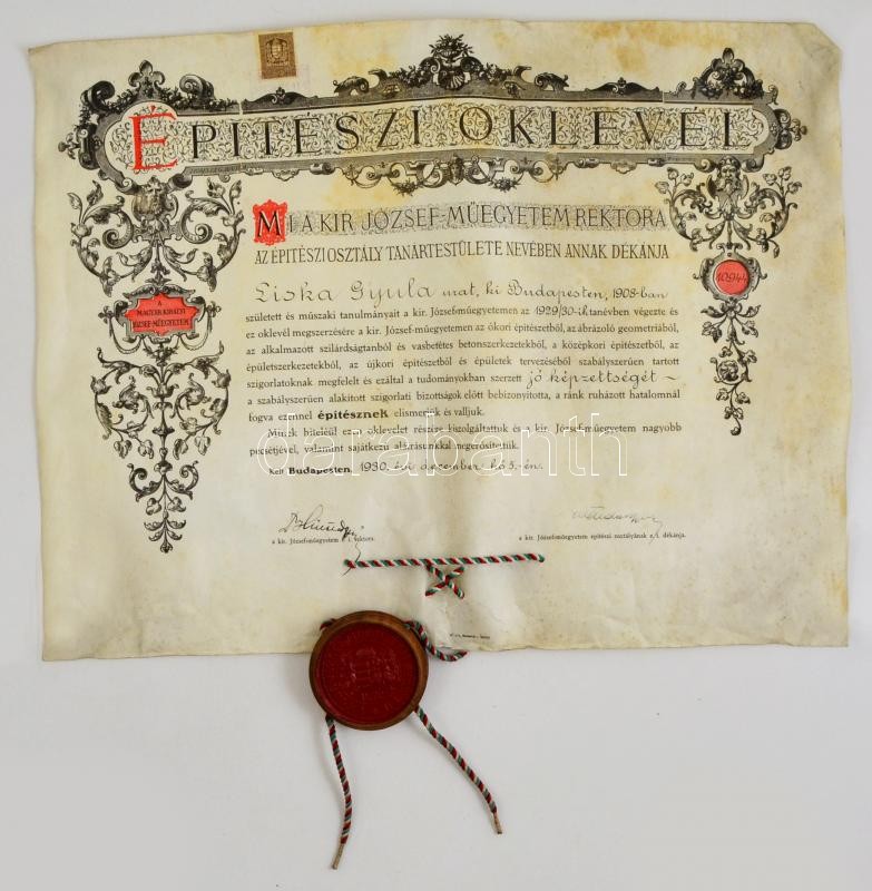 1930 M. Kir. József-Műegyetem építész diplomája Liska Gyula (1908-?) építész részére, Dr. Hültl Dezső (1870-1946) építész, egyetemi tanár, az egyetem rektorának (1930-1932), korábban a mérnöki és építészi osztály dékánja (1917-1919), Wälder Gyula (1884-1944) építész, egyetemi tanár, a mérnöki és építészi osztály dékánjának (1930-1932), később az egyetem rektorának (1938-1939) aláírásával, fatokos függő pecséttel, a fatok összeszorult, nem lehet kinyitni, sérült, eredeti tokban.