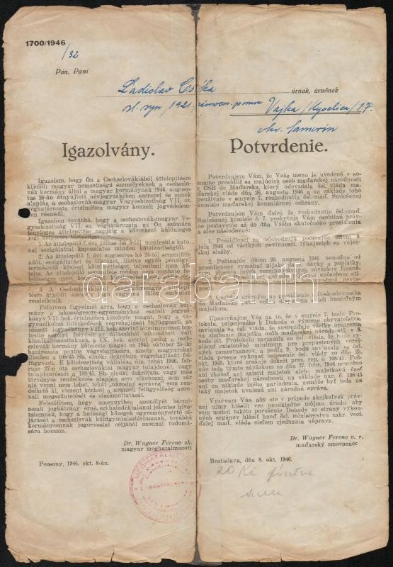 https://www.darabanth.com/en/318-Online-auction/318.0/Other-collectibles/Documents~16/1946-Csehszlovakiabol-attelepitett-magyar-reszere-szolo-igazolvany-Hatoldalan-ragasztva~II1757519
