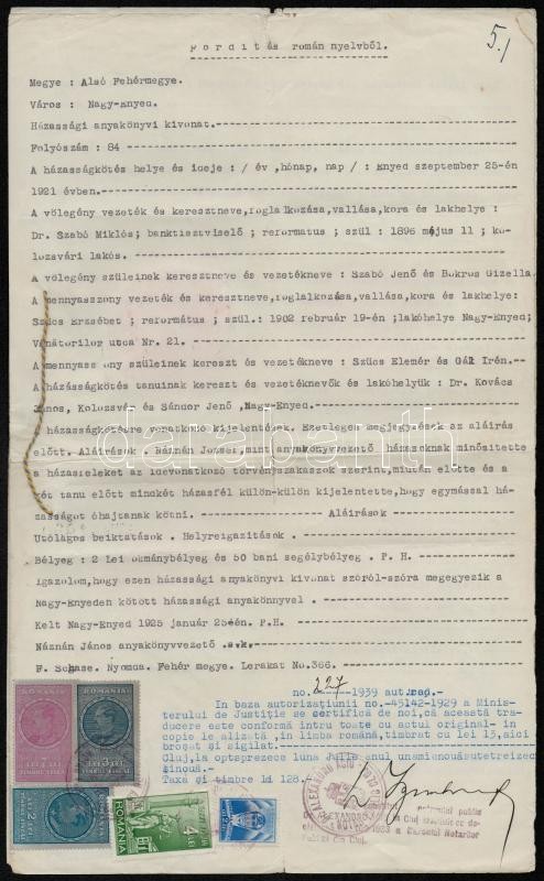 Nagy Enyed 1925 házassági anyakönyvi kivonat fordítása/ Document and translation with Romanian and Hungarian fiscal stamps