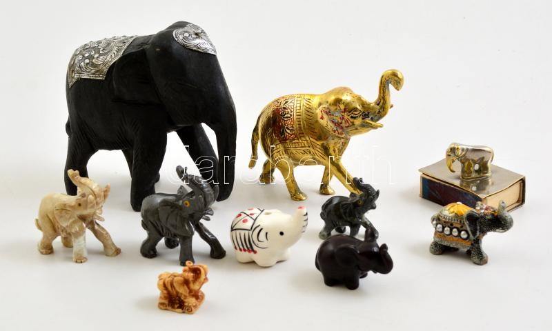 10 db elefánt kis figura, fa,fém, műanyag, porcelán, m: 5-11 cm