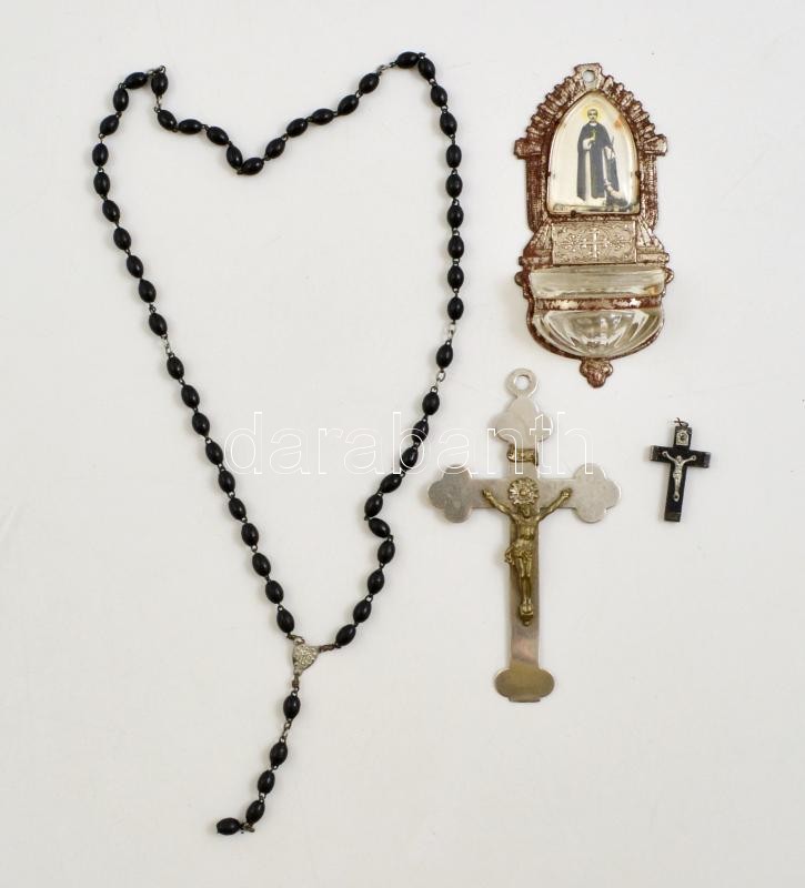 3 db kisméretű kegytárgy (kereszt, szenteltvíztartó, rózsafüzér)