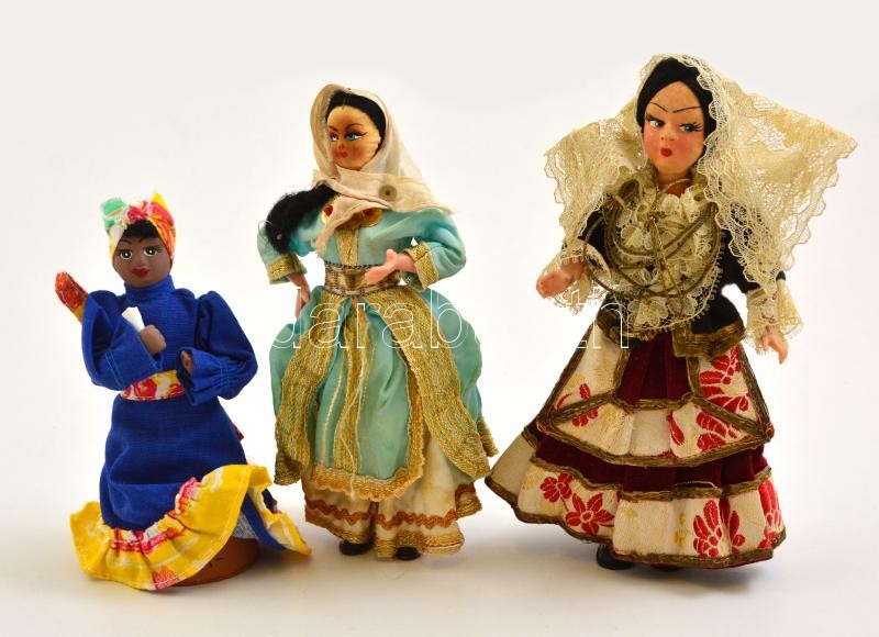 3 db különböző népviseletekbe öltöztetett baba, m: 15-18 cm