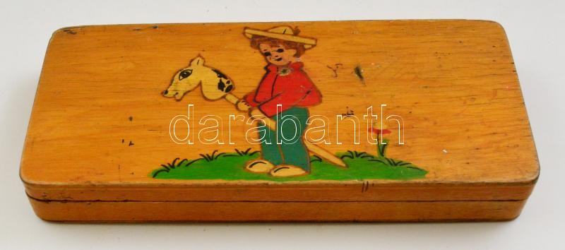 Lovacskás írószertartó fa doboz, festett, kis hibákkal, 9,5×22 cm