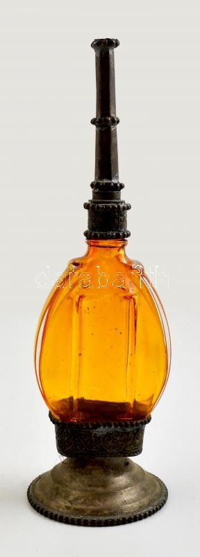 Régi parfümös üveg, fém szerelékkel, m: 26 cm