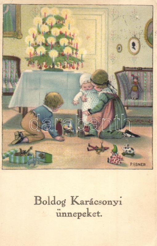 Boldog Karácsonyi Ünnepeket! / Christmas greeting card with children, Christmas tree, toys. Erika Nr. 6049. s: P. Ebner (EK)