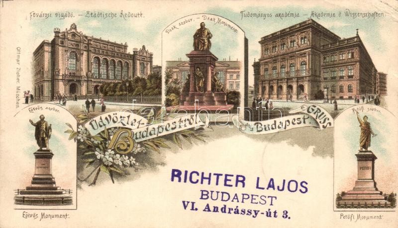 1897 (Vorläufer!) Budapest, Fővárosi vigadó, Deák, Petőfi és Eötvös szobor, Tudományos akadémia. Art Nouveau, floral, litho (EK)