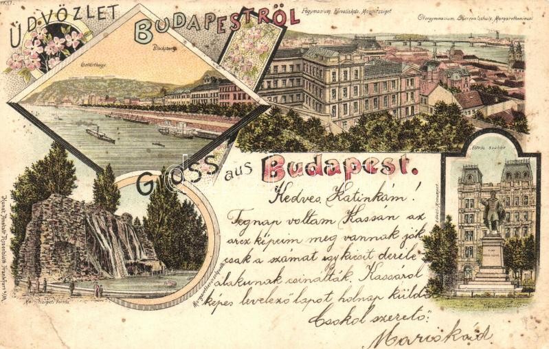 1898 (Vorläufer!) Budapest, Gellérthegy, margitszigeti forrás, Eötvös szobor, főgimnázium és főreáliskola. Art Nouveau, floral, litho (EK)