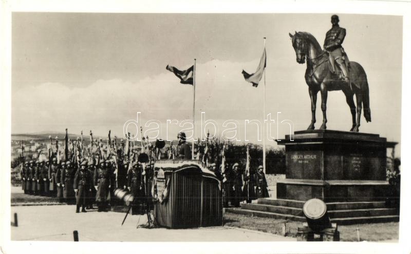 Description: 1941 Budapest I. Az 1848-49-es szabadságharci zászlók ünnepélyes hazahozatala Oroszországból. Az ünnepség színhelye a Hadimúzeum és a Görgey Artúr lovas szobor előtt (EK)