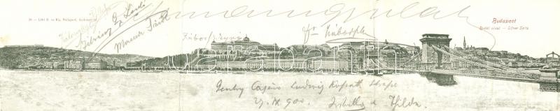 Budapest, Budai oldal, Lánchíd, Királyi vár. Löbl D. és Fia 39. 3-részes kihajtható panorámalap